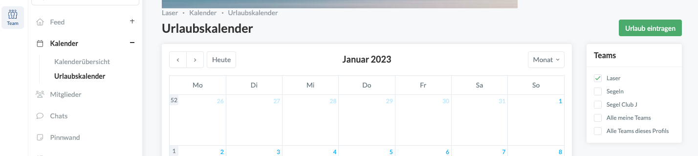 Hier kannst du alle Urlaube sehen, die in den Teams eingetragen sind.