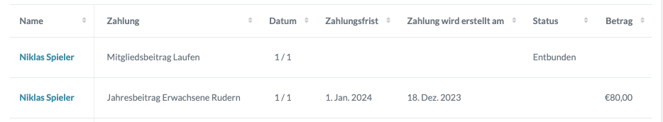 Du kannst außerdem überprüfen, ob der Vorgang korrekt durchgeführt wurde, indem du in Kommende Zahlungen gehst. Hier ist das Mitglied nun als Entbunden in der Spalte Status ersichtlich.