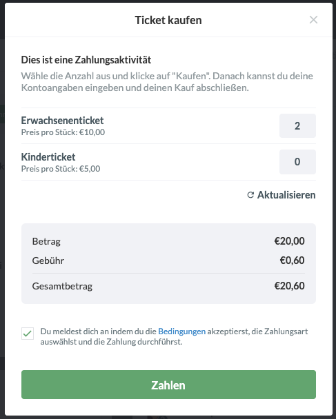 Bei der Anmeldung hat das Mitglied nun die Wahl zwischen den verschiedenen Ticketarten und kann den Vorgang abschließen, indem sie/er die Geschäftsbedingungen akzeptiert und auf Zahlen klickt.