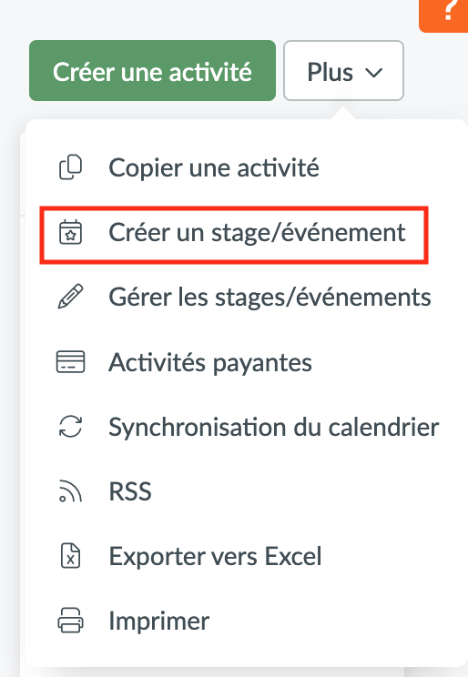 3. Cliquer ensuite Plus en haut à droite et sur Créer un stage/événement.