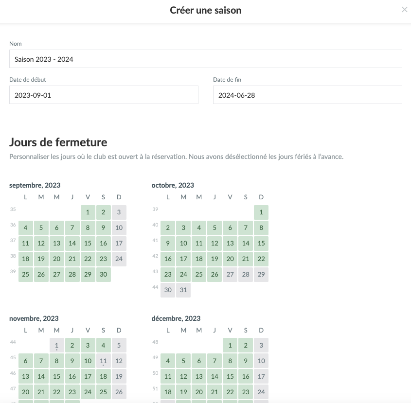 - Vous pouvez également bloquer certaines dates. Votre club est fermé le dimanche ? Pas de problème, vous pouvez désactiver la réservation des ressources.