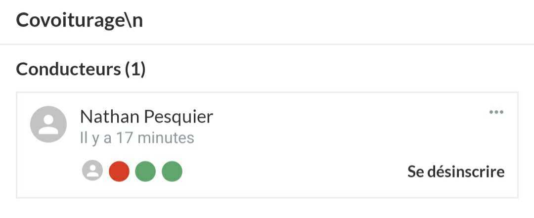 Exemple : Nathan est conducteur et dispose de 4 places dans la voiture. 2 places sont réservées, il y en a donc 2 disponibles (en vert)