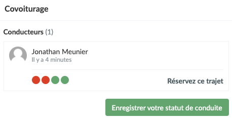 Exemple : Jonathan est conducteur et dispose de 4 places dans la voiture. 2 places sont réservées, il y en a donc 2 disponibles (en vert)